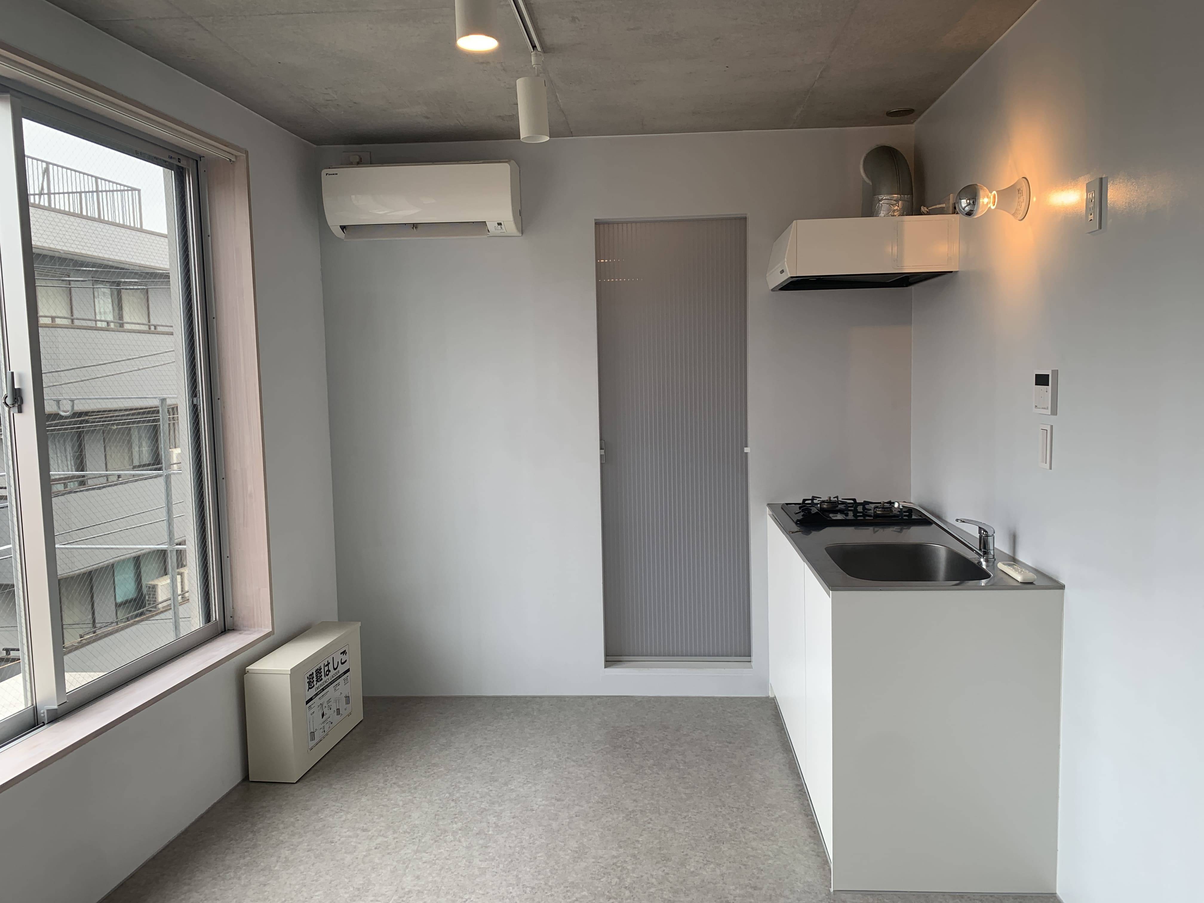そのような風情の中にこの集合住宅では14戸のワンルーム住戸と8戸のメゾネット住戸を計画している。日影規制がかからない10mの高さの中で、事業としては共用部を削ぎ落として建蔽率の許す限り専有面積を最大化したい。手前(A棟)と奥(B棟)の分棟とし、A棟には建蔽率に算入されない基壇を設けて直接のアクセスとして、その他は共用廊下を設けずに階段室とブリッジによって動線を集約している。40%の空地はシンプルに道路際と住棟間にまとめられて、周辺の建物のスケールに対して不釣り合いな大きなピロティによって繋がれる。