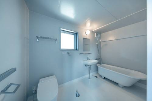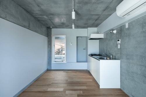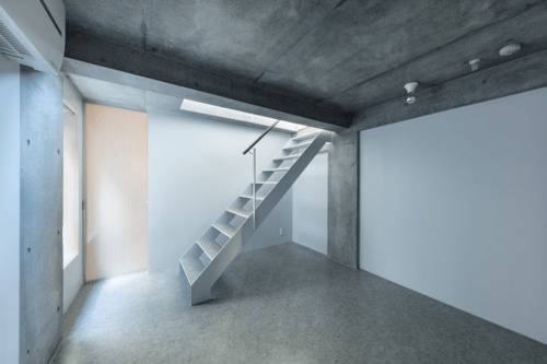 そのような風情の中にこの集合住宅では14戸のワンルーム住戸と8戸のメゾネット住戸を計画している。日影規制がかからない10mの高さの中で、事業としては共用部を削ぎ落として建蔽率の許す限り専有面積を最大化したい。手前(A棟)と奥(B棟)の分棟とし、A棟には建蔽率に算入されない基壇を設けて直接のアクセスとして、その他は共用廊下を設けずに階段室とブリッジによって動線を集約している。40%の空地はシンプルに道路際と住棟間にまとめられて、周辺の建物のスケールに対して不釣り合いな大きなピロティによって繋がれる。