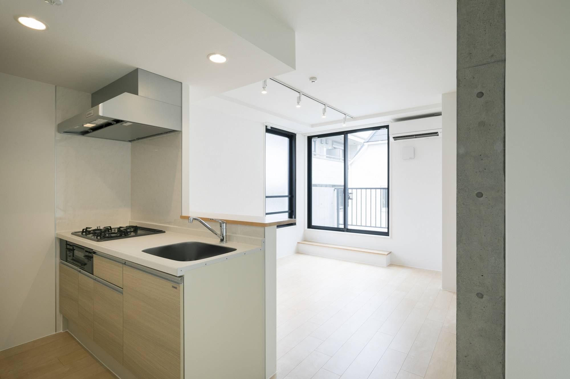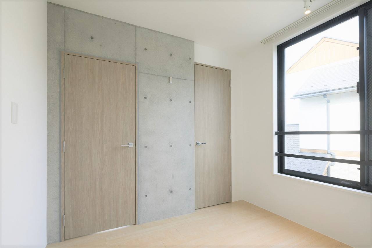 Interior: デザイナーズの定番である「コンクリート打ち放し」の壁面が、都会的でクールな印象を演出。スポットライトが室内をスタイリッシュに照らし出します。