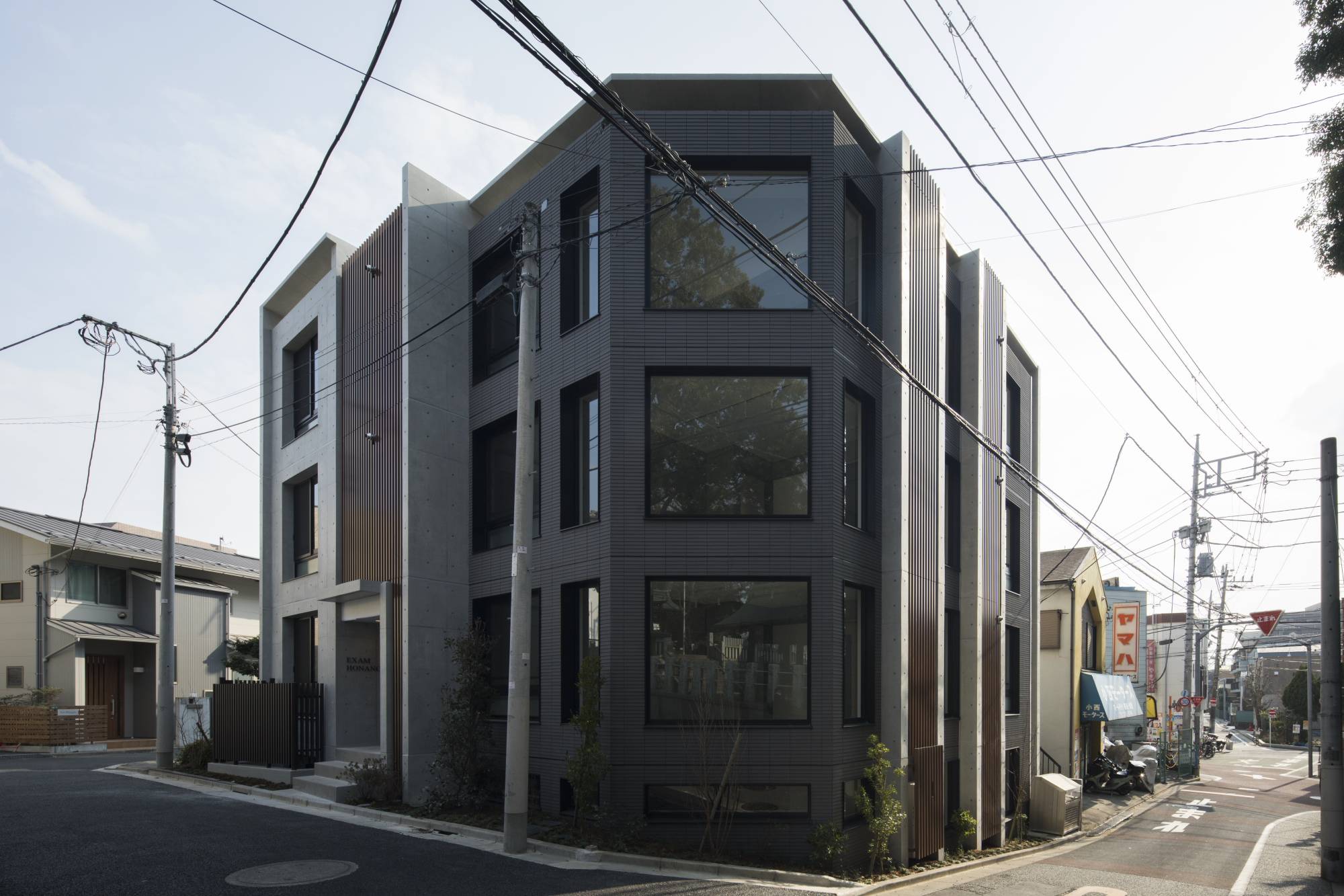 通りには神社やお寺が並んでおり、そのシックで穏やかな雰囲気と寄り添うように、外装デザインにはダークグレーの瓦をイメージしたタイルを合わせました。