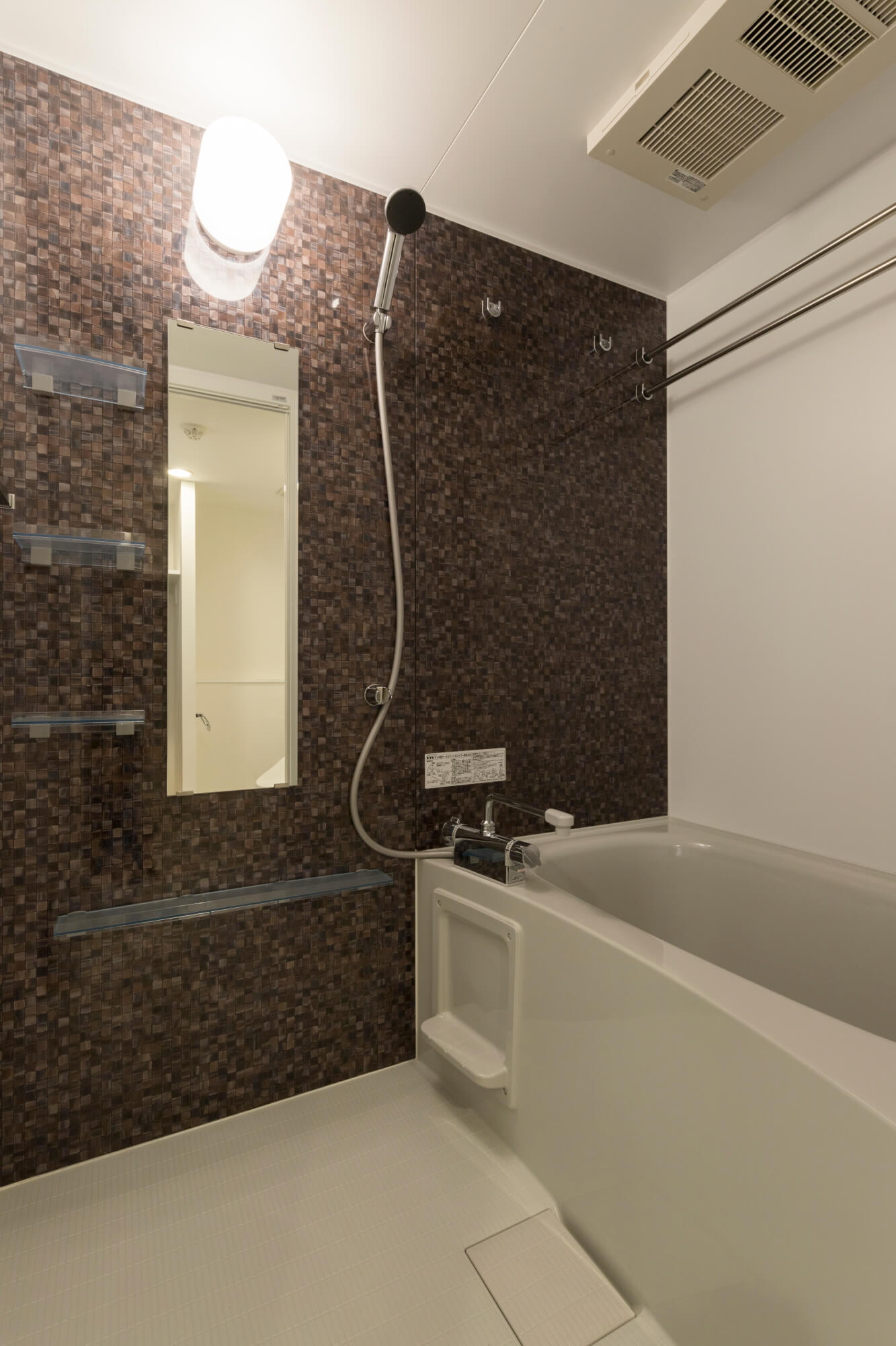 エントランスアプローチは隣の神社の木々の雰囲気を感じさせるような木目調の天井ルーバー、都心のスタイリッシュさを演出するコンクリート打ち放しの壁面で日常のon/offを切り替える装置となり、このエリアでは一線を画した空間を感じることが出来ます。